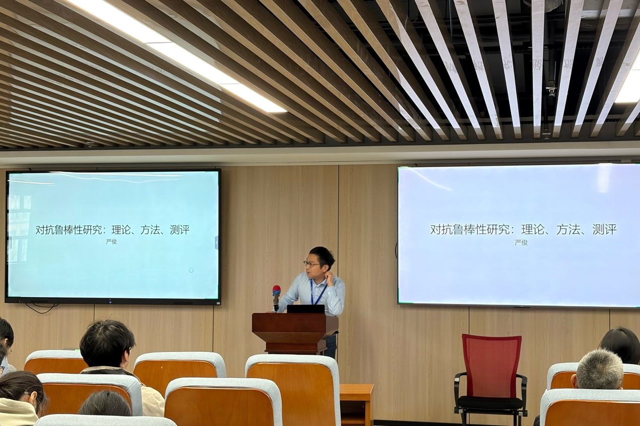 严俊老师作了题为《对抗鲁棒性研究:理论、方法、测评》的报告。报告围绕人工智能系统在实际部署中面临的安全风险展开,指出深度学习模型在赋能现实应用的同时,也存在对抗攻击易感、模型鲁棒性不足等问题,因此亟须发展可审核、可监督、可追溯、可信赖的人工智能技术。严老师从攻击、防御与测评三个层面,系统梳理了对抗鲁棒性研究的核心问题与发展脉络,重点介绍了面向计算机视觉任务的鲁棒优化方法及现实系统安全测评思路。