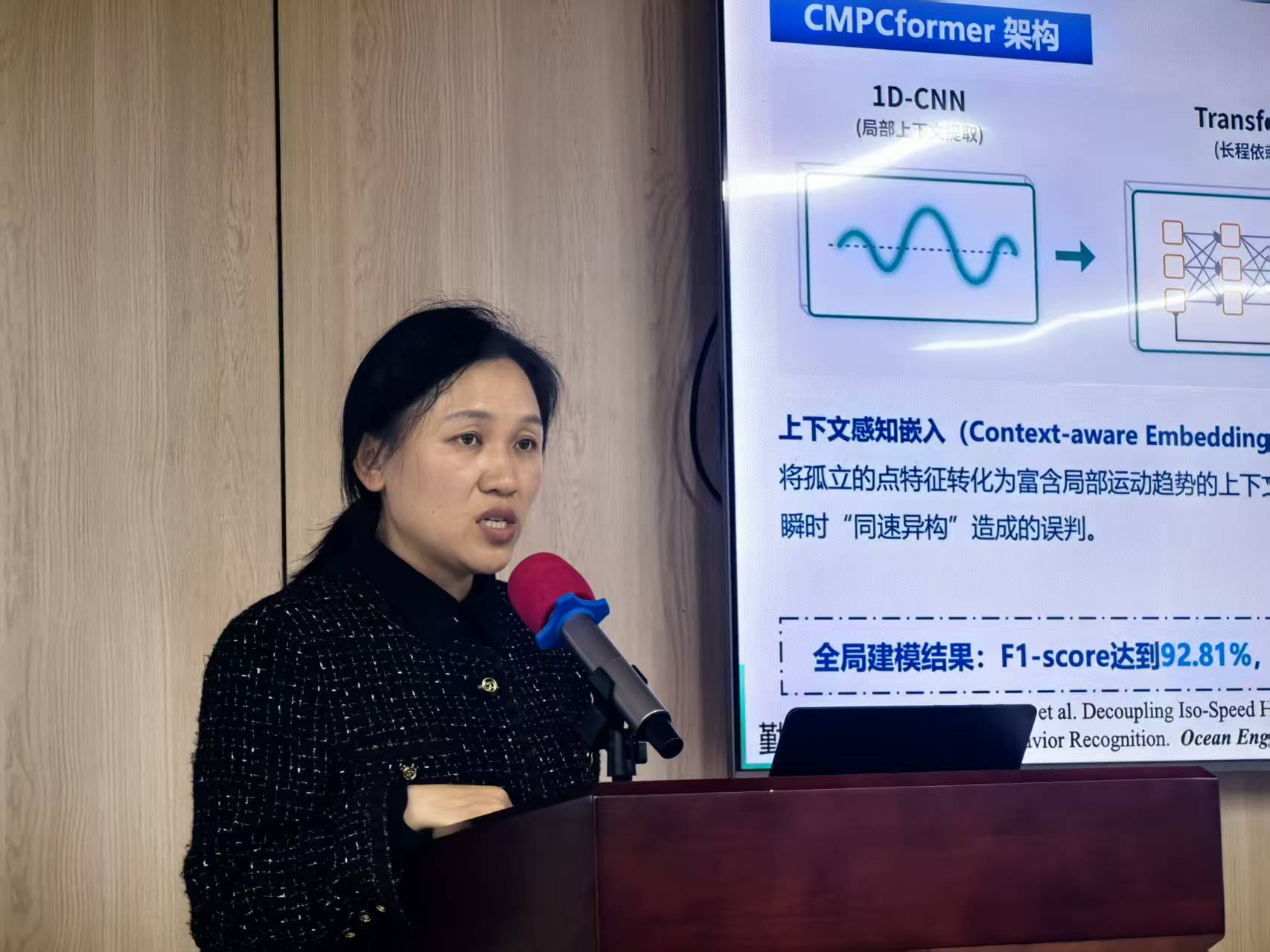 国家自然科学基金青年科学基金获得者杜艳玲老师作了题为《时空大数据驱动的海洋多源目标智能感知:轨迹、模式与行为认知》的报告。报告聚焦海洋中尺度涡演化预测、轨迹模式挖掘以及基于AIS数据的船舶分类与行为识别等方向,系统展示了时空大数据与人工智能在海洋目标感知中的研究进展。围绕海洋中尺度涡动态演化这一关键科学问题,从Transformer、双图学习、多模态时空图网络到生成式演化建模等一系列方法,重点阐释了如何通过引入物理先验、多体交互建模和环境场融合,提升对复杂海洋目标轨迹预测的精度与鲁棒性。
